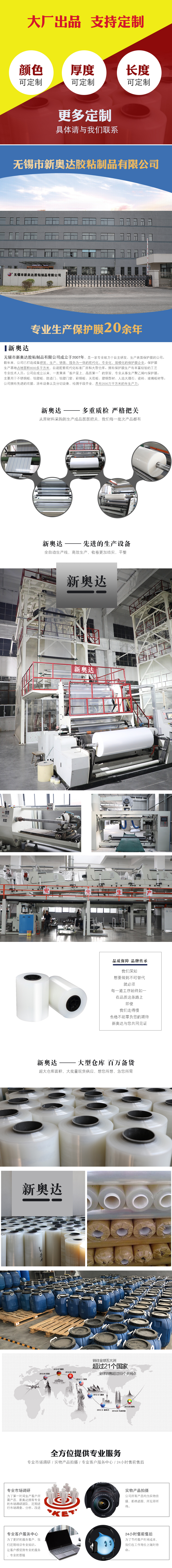 公司主要产品有:PE保护膜,PE保护蓝膜,乳白保护膜,黑白保护膜,高透明保护膜,网纹膜,印字膜,不锈钢保护膜,铝塑板保护膜,铝板保护膜,铝塑型材保护膜,玻璃保护膜,塑料板保护膜,地毯保护膜,地板/瓷砖保护膜,彩钢板保护膜 等其他保护膜。公司通过多年的努力,多次荣获国家多项证书,这是对我公司产品质量的认可,也是对我们的鼓励,我们将一如既往提供优质的产品和优质的服务!